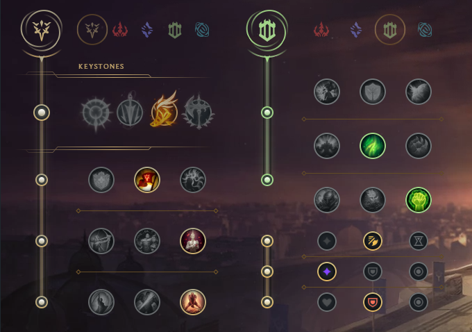 La Rancune de Serylda permet à Tryndamere de contrer l'armure tout en gagnant en haste. Enfin, le Rappel Mortel n'est à faire que contre des équipes avec du soin. Enfin, L'Ange gardien est une valeur sûre en terme de survie notament face aux compositions AD.