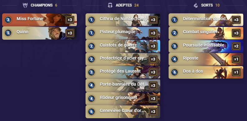 Ce deck est désormais un classique de la méta, utilisant les nombreuses créatures puissantes de Demacia pour prendre rapidement le contrôle du plateau grâce aux stats pures des différents adeptes. Avec Quinn et surtout Miss Fortune en prime pour jouer agressivement, le tout en boostant vos cartes avec Porte-bannière du Détachement, il est facile de plier la partie en seulement quelques tours avant que l'adversaire puisse renverser la tendance.