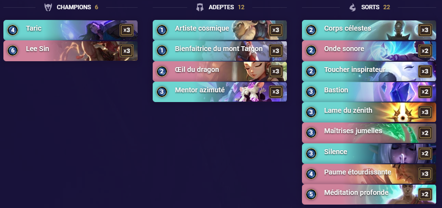 Ce deck combo est assez unique : il vise à monter de niveau Lee Sin en jouant beaucoup de sorts, afin de le booster avec Lame du zénith pour qu'il puisse one-shot un adversaire grâce à Surpuissance. En prime, Taric est présent pour aider Lee Sin à rester en vie, tandis que des cartes comme Oeil du dragon et Méditation profonde ont une excellente synergie avec les nombreux sorts de ce deck.