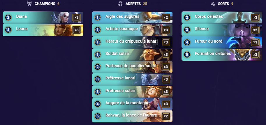 Avec l'Appel de la montagne, plusieurs nouveaux archétypes sont nés de la région Targon. La combinaison de Diana et Leona fonctionne très bien, avec les cartes Aurore que vous voulez jouer en début de tour et les cartes Crépuscule ensuite. La combinaison des deux permet de générer beaucoup de tempo et de value en milieu de partie, permettant à ce deck d'avoir sa chance contre les aggros comme les contrôles.
