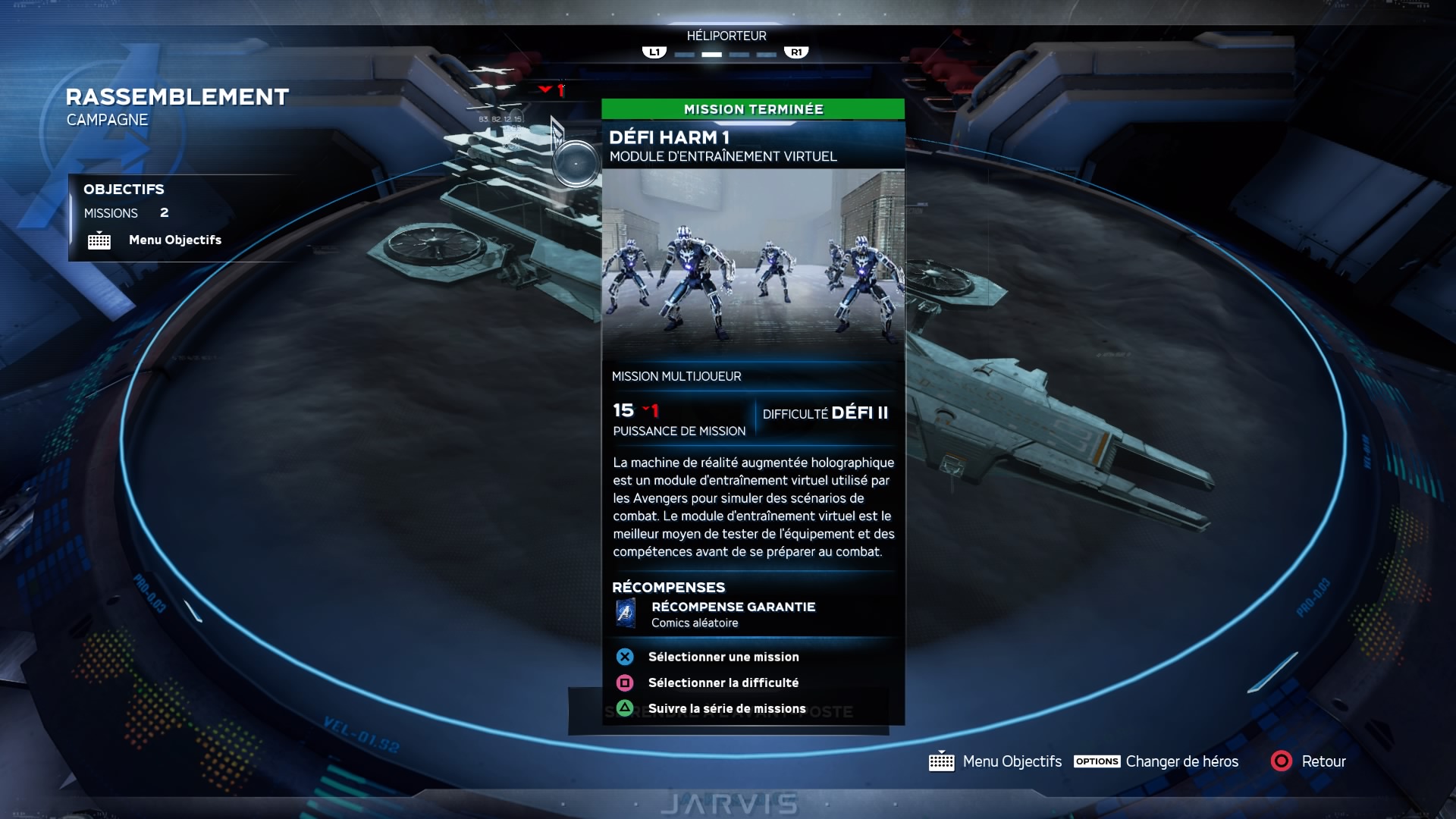 Une fois ces trois missions complétées, JARVIS, vous informera que la salle HARM est désormais disponible, il vous faudra donc vous rendre tout à l'arrière du vaisseau puis descendre d'un étage pour arriver dans une sorte de labo.