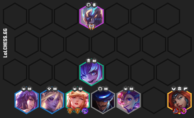 Une autre composition très efficace est la combinaison de 6 Sorciers et un champion légendaire. Les Sorciers seront plutôt efficaces en milieu de partie, surtout lorsque vous en aurez 6, mais il vous faudra des objets défensifs pour palier à votre manque de frontline (Médaillon de l'Iron Solari, Ange gardien). Le meilleur champion légendaire à utiliser sera Miss Fortune, suivie par Aurelion Sol et Gangplank à égalité, et Ekko en dernière option.