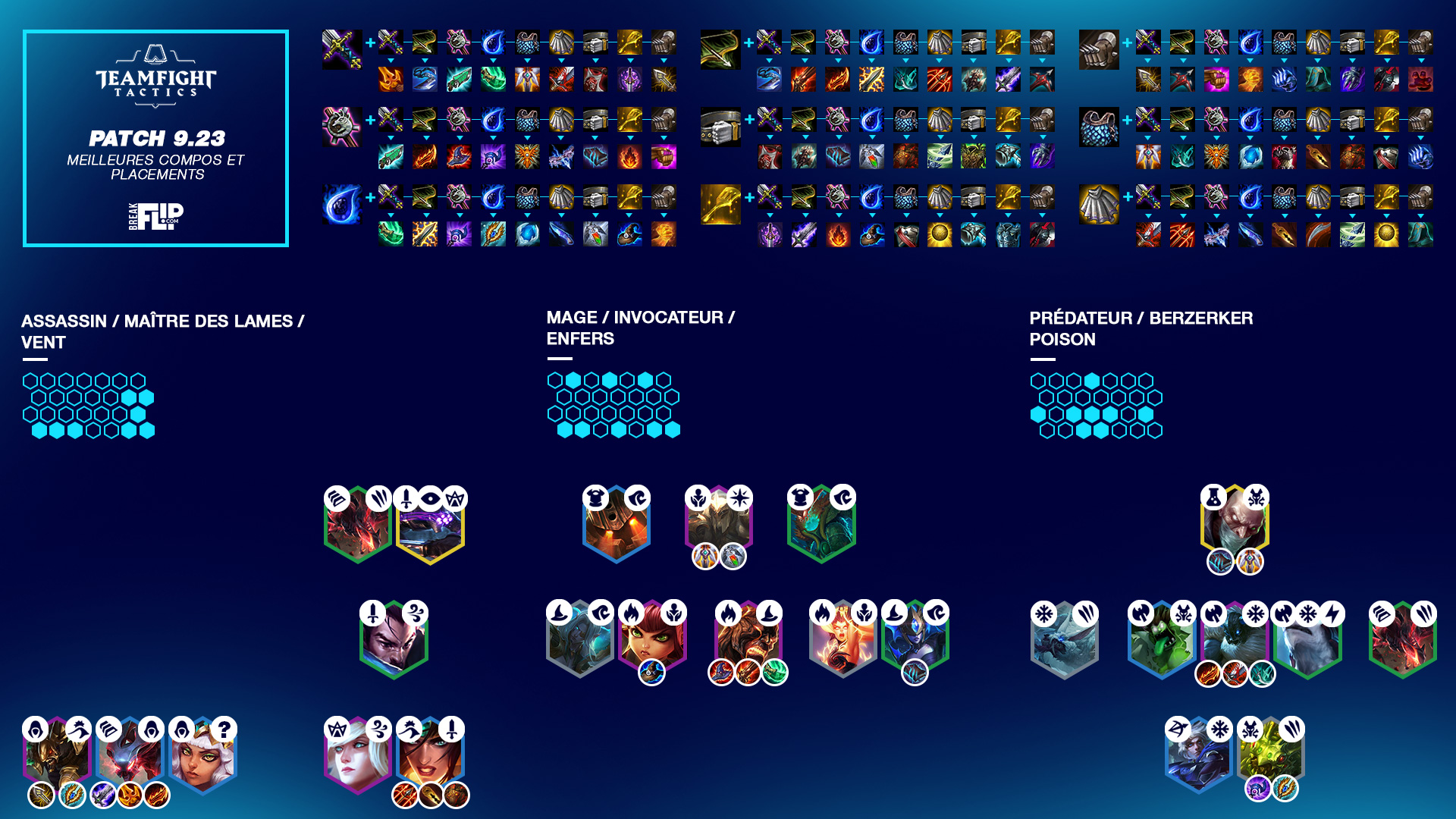 Le patch 9.23 de Teamfight Tactics est arrivé, et il amène avec lui le retour des parties classées. Afin d'être préparés pour votre remontée sur le ladder, nous vous présentons notre cheat sheet des trois meilleures compositions du moment afin de toujours savoir quoi acheter et comment les positionner !