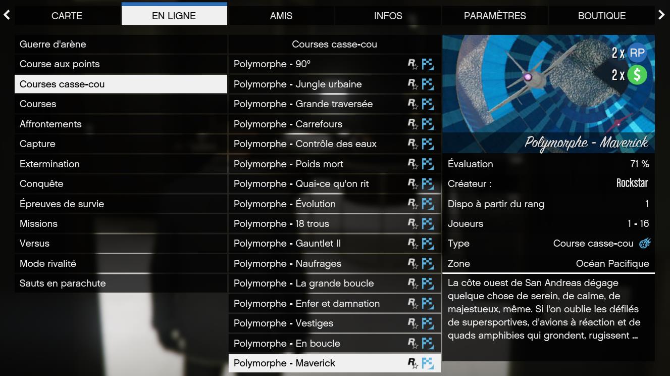 Le mode Online de GTA 5 regorge d'activités différentes, plus ou moins lucratives. Ces activités sont soient des activités rapides comme des courses, des braquages, ou encore des missions de livraisons. Ces activités viennent également d'être étoffées par les missions de Gerald. Parmi ces missions et ces activités on retrouve notamment des courses casse-cou, un peu spéciale, les courses Polymorphe.