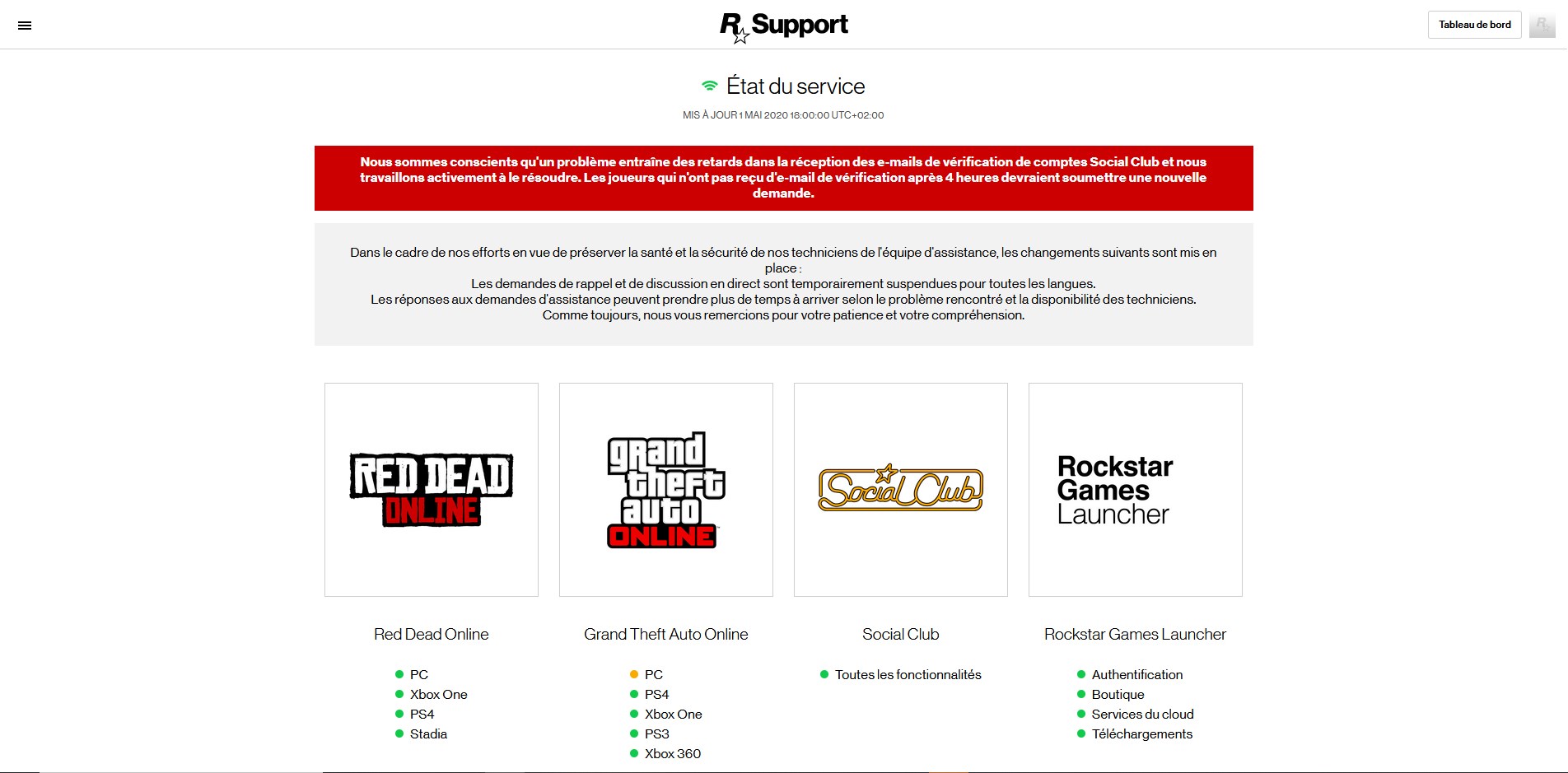 Sur les réseaux sociaux, Rockstar Games n'a absolument pas communiqué, il n'y a donc pas de solution miracle officielle. Tout ce que l'on sait, c'est que lorsque l'on regarde l'état officiel des serveurs (source en français), l'accès à GTA 5 Online sur PC est limité.