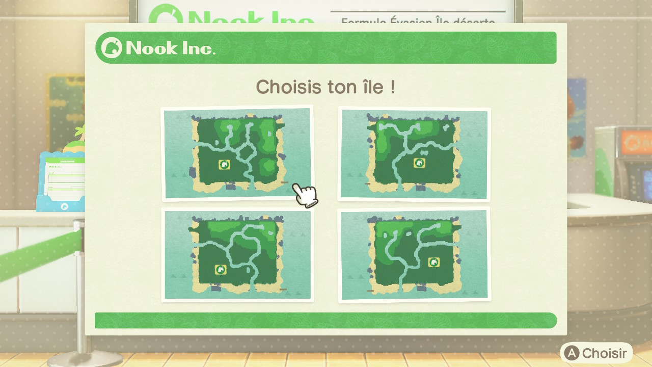 Concernant l'île, Méli et Mélo vous proposeront de choisir entre 4 topographies (ou dispositions) d'îles différentes. Il n'y a pas vraiment de bon ou de mauvais choix à faire à ce niveau-là, choisissez celle qui vous plaît le plus ! On vous recommande cependant de prendre celle où l'espace où se situe le Bureau des résidents (l'icône de la feuille) est le plus grand, car au départ, vous ne pourrez pas traverser les rivières !