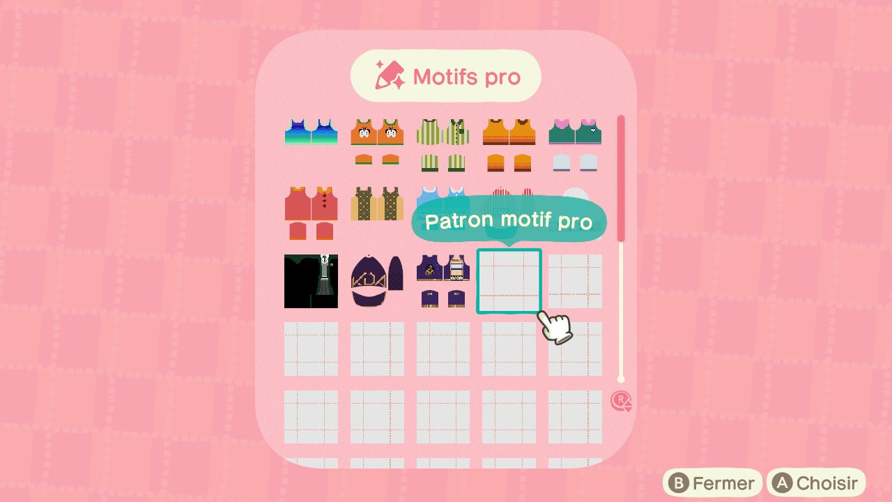 Pour créer vos propres designs, vous devez avoir débloquer la première maison. Il vous faudra investir 800 miles Nook dans les « motifs persos pour les pros » sur le terminal Nook et vous pourrez ensuite donner libre cours à votre fibre artistique !