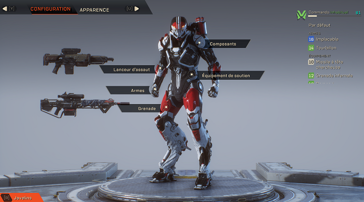 Comme tous les javelins, le commando a la possibilité de s'équiper de composants boostant ses statistiques et ses compétences.