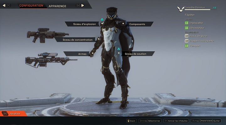 Comme tous les javelins, le Tempête a la possibilité de s'équiper de composants boostant ses statistiques et ses compétences.