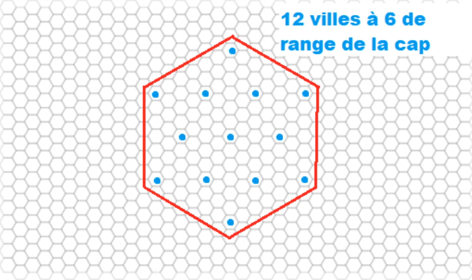 Si vous respectez ce modèle, vous pourrez avoir jusqu'à 13 villes à 6 cases de la capitale, tout en respectant la distance minimale de 4 cases entre deux villes. (Source : Malm34)