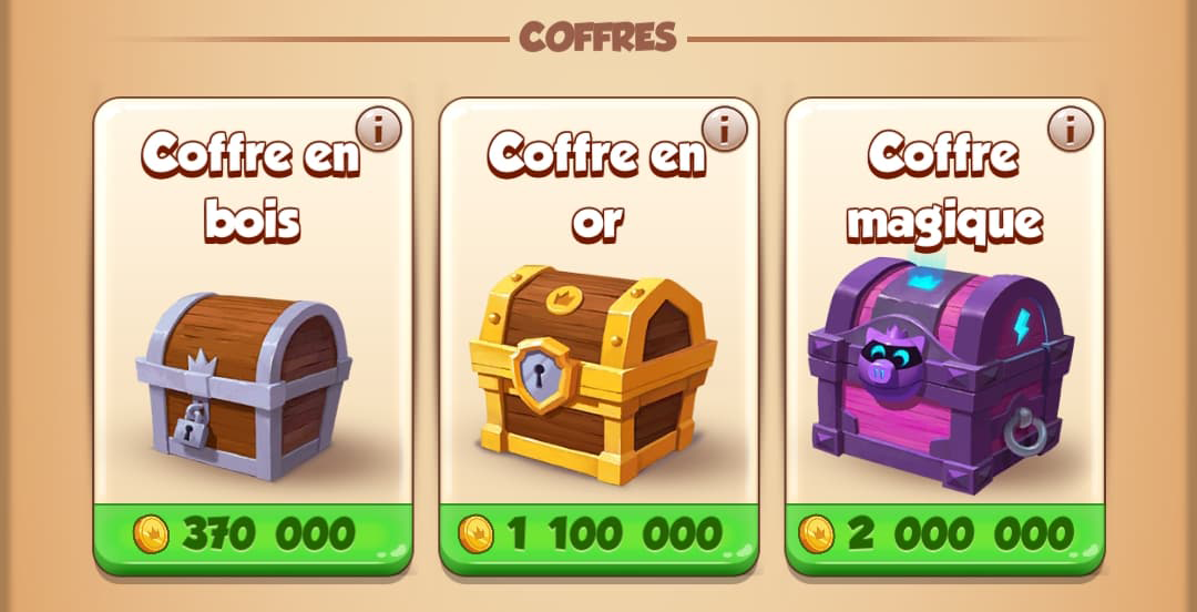 Vous pouvez également acheter des coffres directement dans la boutique du jeu, pour avoir des cartes plus rapidement. Trois types de coffres sont proposés, et plus le coffre est cher, plus il contient un nombre important de cartes. La rareté des cartes que vous obtiendrez dépend de votre niveau actuel, et si votre niveau est élevé, vous pourrez même tomber sur des cartes en or ! Ces cartes permettent d'obtenir des récompenses plus importantes que les autres une fois leur série complétée.