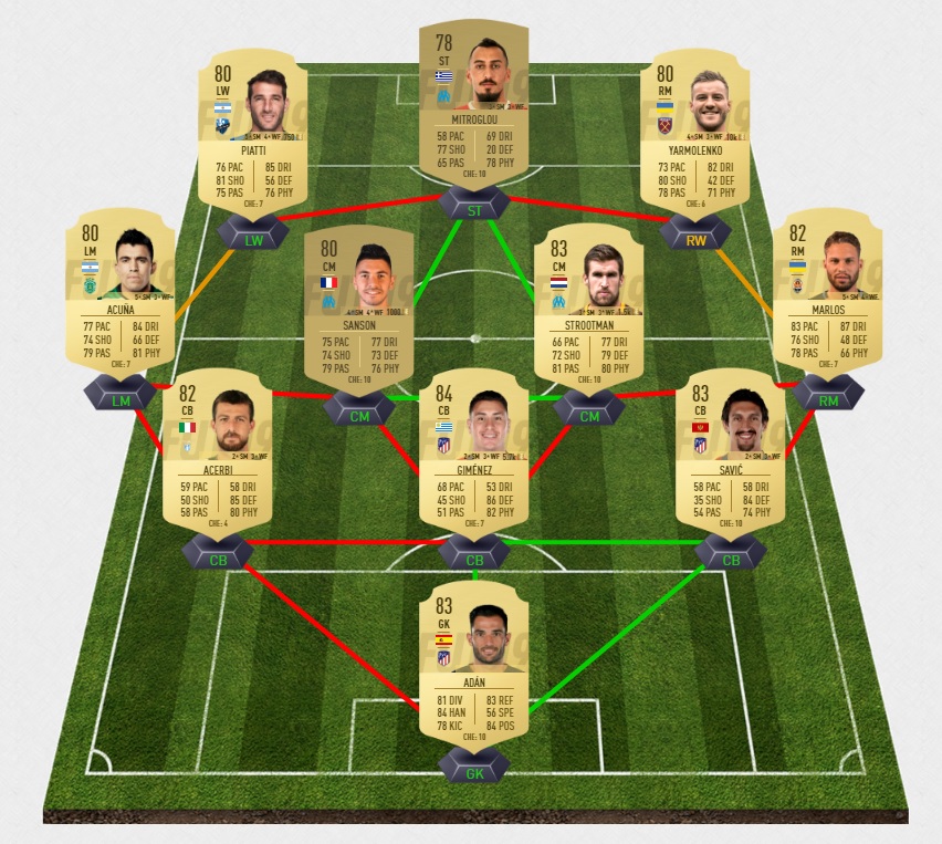 Mise à jour du 22/11 : La solution a été mise à jour afin de présenter une formation plus simple et complète (et qui fonctionne), évitant de devoir donner un maximum de points de collectif (il en faudra ici sur 10 joueurs). En outre, Gimenez peut-être remplacé par un autre défenseur central évoluant en ligue espagnole, tant que celui-ci est d'une nationalité différente de celles déjà présentes dans la formation. On peut également remplacer Acerbi par un joueur du championnat allemand.
