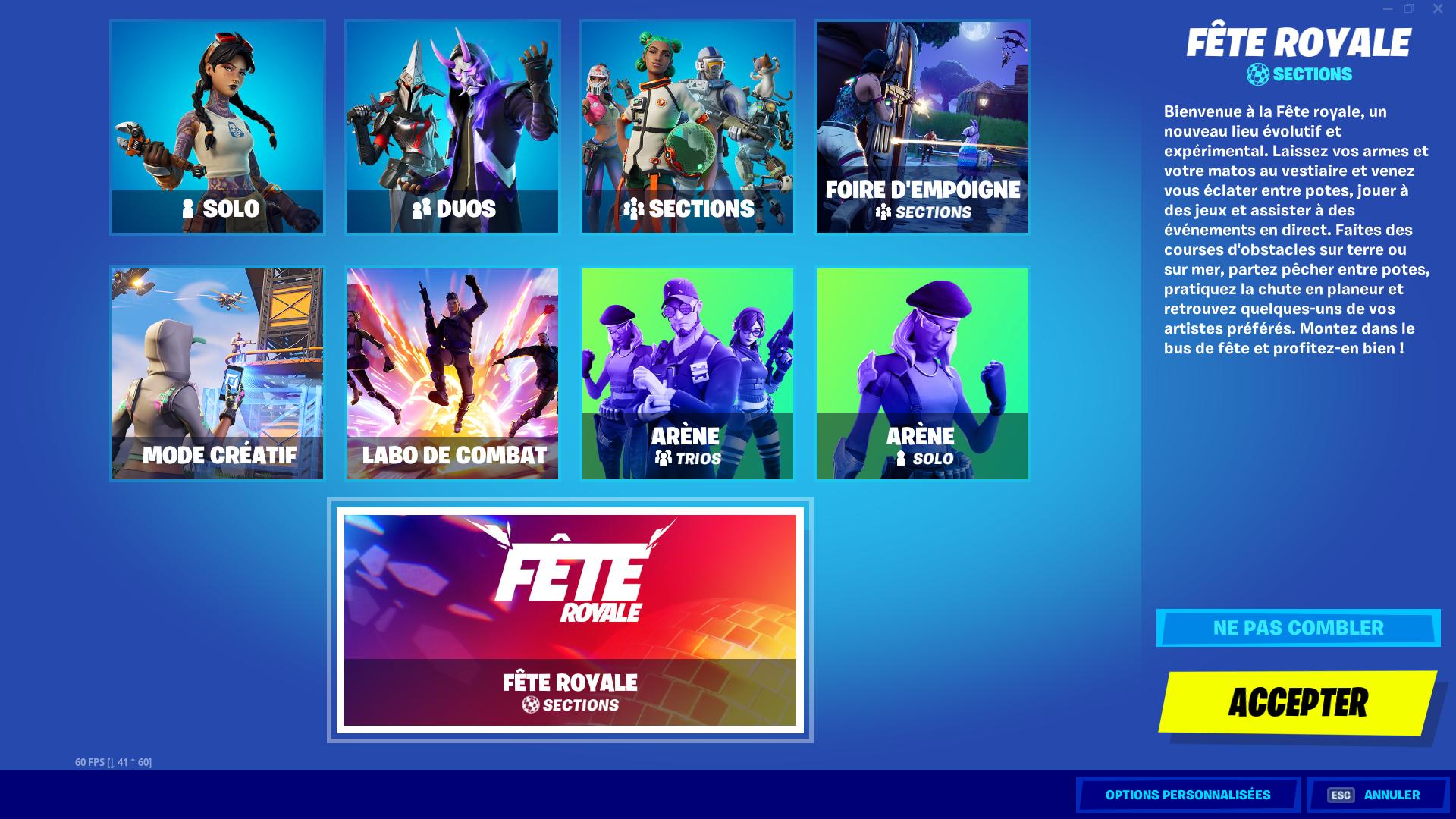 Avant de re-parler de l'heure, il est bon de savoir comment accéder au concert depuis Fortnite. Rien de bien difficile, vous allez devoir lancer le mode Battle Royale (gratuit) et changer le mode de jeu en mettant Fête royale (Party royale en anglais). Une fois cela fait, lancez le jeu, allez jusqu'à la scène et le tour est joué !