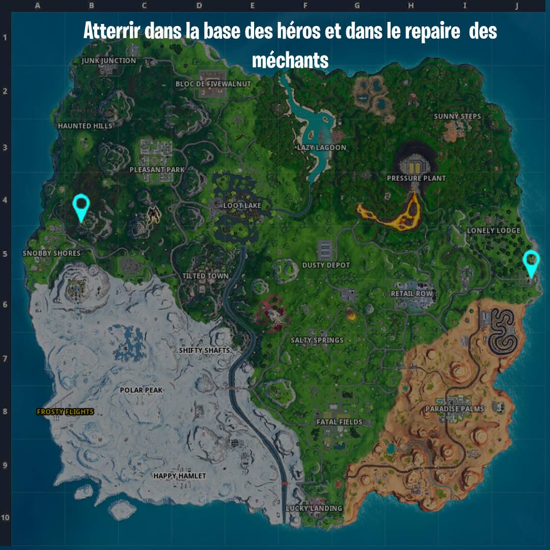 Dans ce défi, il vous est demandé d'atterrir dans la base des héros et dans le repaire abandonné des méchants. Alors que la base des héros est du côté de Lonely Lodge, le repaire des méchants est sur la montagne de Snobby Shore. Il suffira d'y atterrir dans ces deux endroits pour que le défi soit validé.