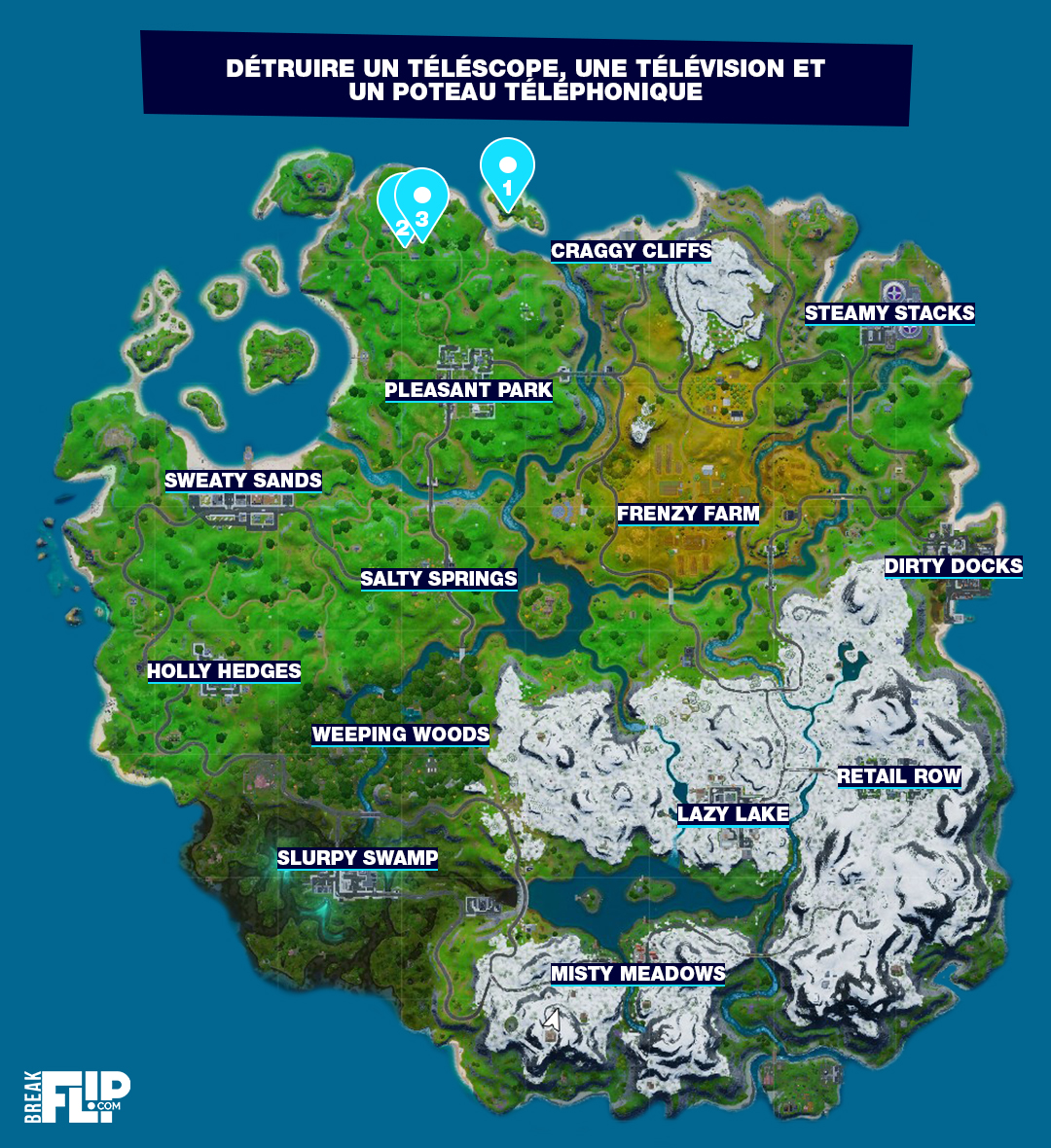 Détruire un téléscope, une télévision et un poteau téléphonique, défis Fortnite