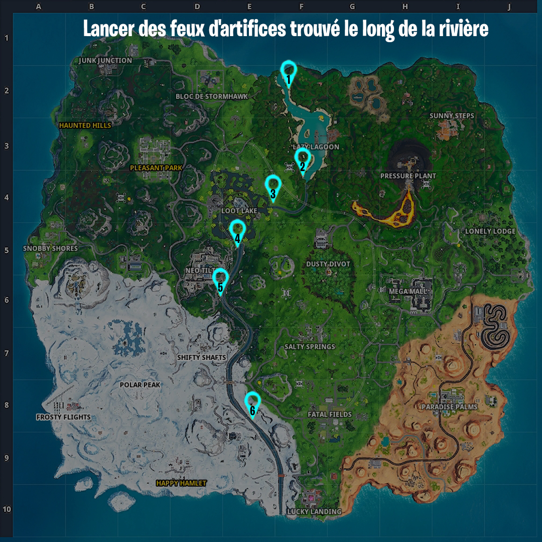 Les feux d'artifices se trouvent un peu partout sur la carte de Fortnite, mais toujours près des points d'eau. C'est donc là que vous devrez vous rendre pour les lancer et ainsi accomplir le défi.