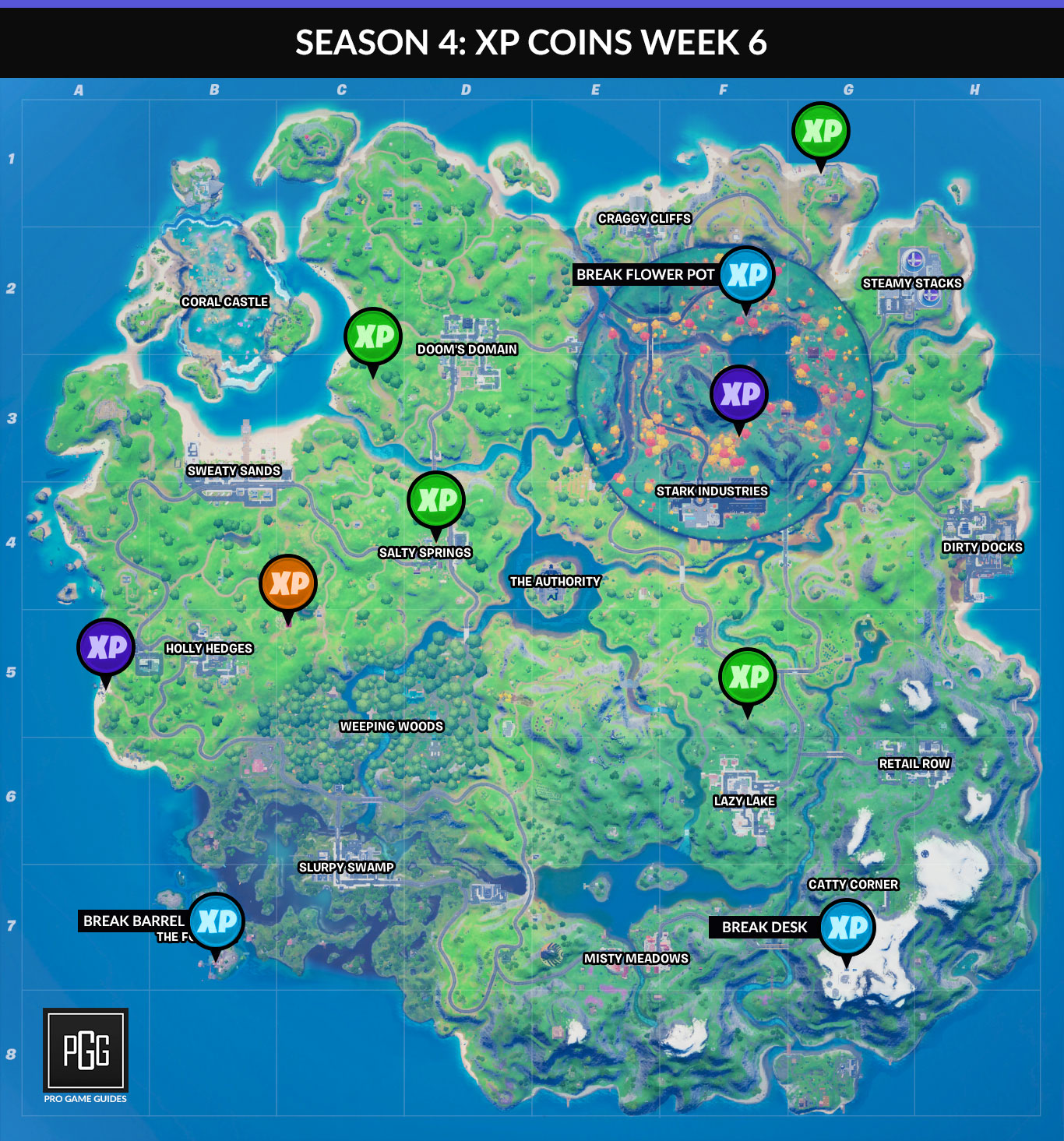 Sur Twitter, Pro Game Guides propose chaque semaine une carte mise à jour avec l'emplacement des différentes pièces d'XP. Découvrez ci-dessous toutes les pièces présentes en semaine 5, saison 4 de Fortnite.