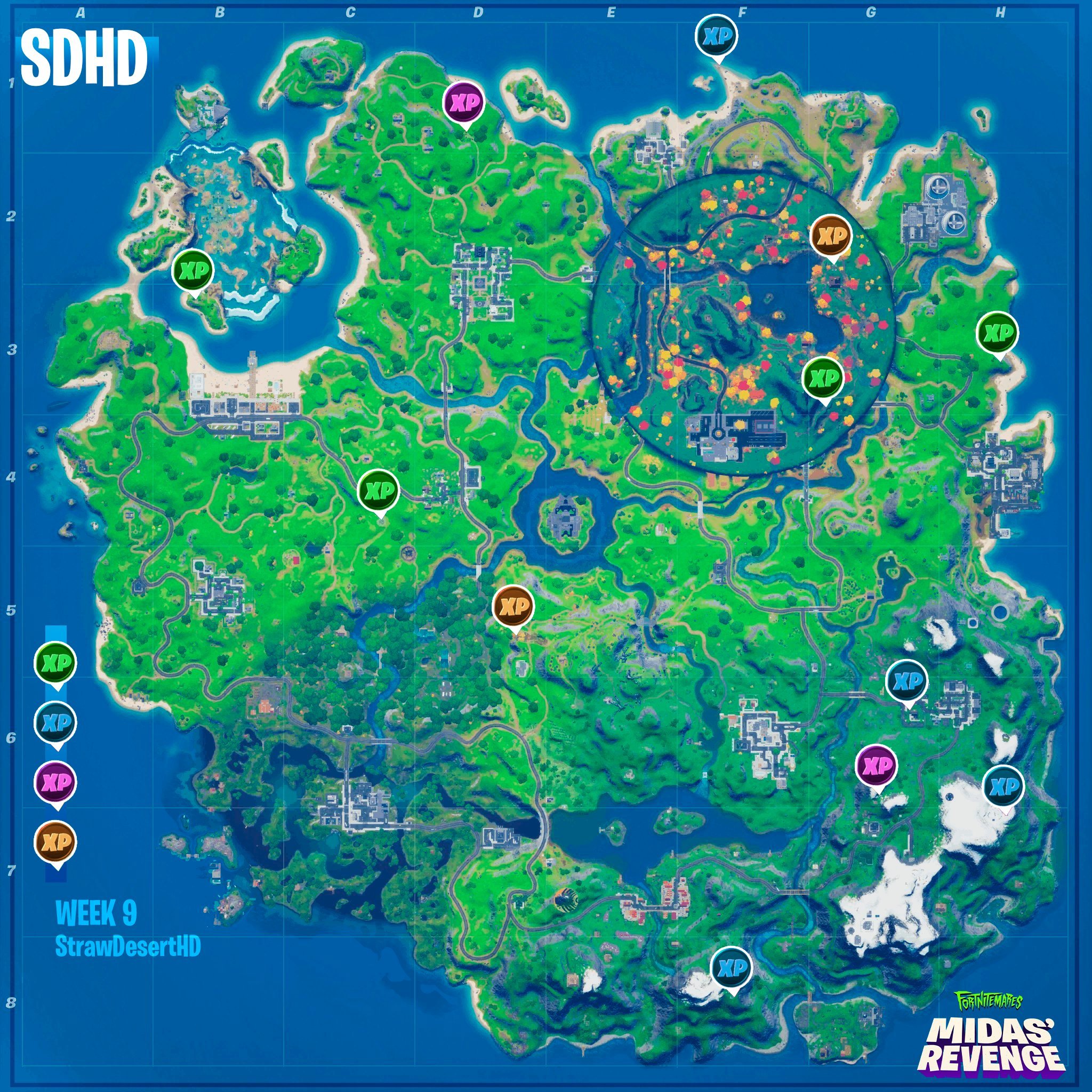 Sur Twitter, StrawDesertHD propose chaque semaine une carte mise à jour avec l'emplacement des différentes pièces d'XP. Découvrez ci-dessous toutes les pièces présentes en semaine 9, saison 4 de Fortnite.