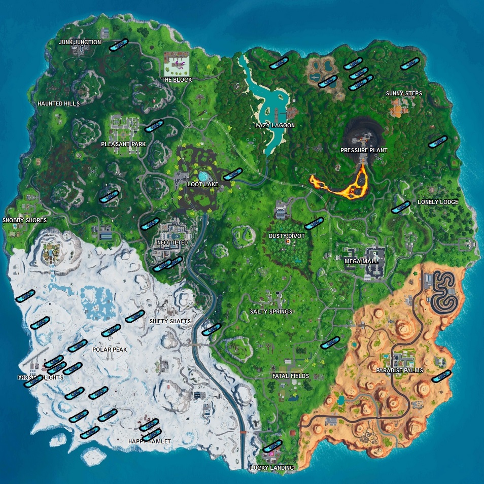 Les défis de la semaine 3 de la saison 9 de Fortnite sont disponibles depuis le jeudi 23 mai. Cette semaine, l'un des défis vous demandera de réaliser une figure avec une Aéroplanche. Où pouvez-vous trouver ces véhicules pour faire le défi ? Nous vous proposons une carte pour vous aider !