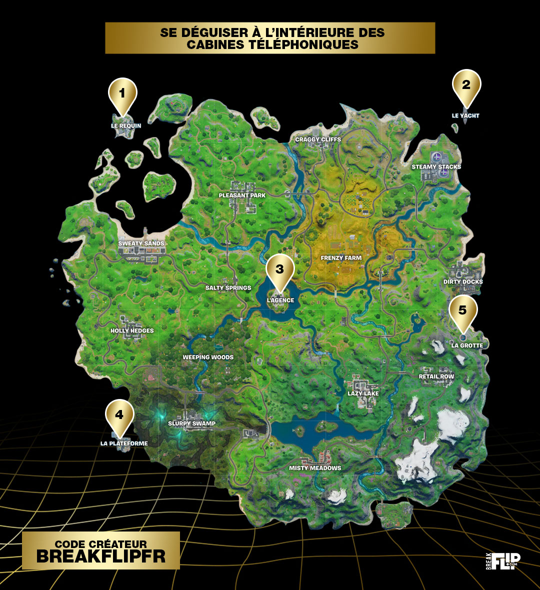 À noter que d'autres cabines sont disséminées ça et là sur la carte, notamment dans les nouvelles villes de la saison 2 : La Plateforme, Le Requin, Le Yacht, La Grotte.