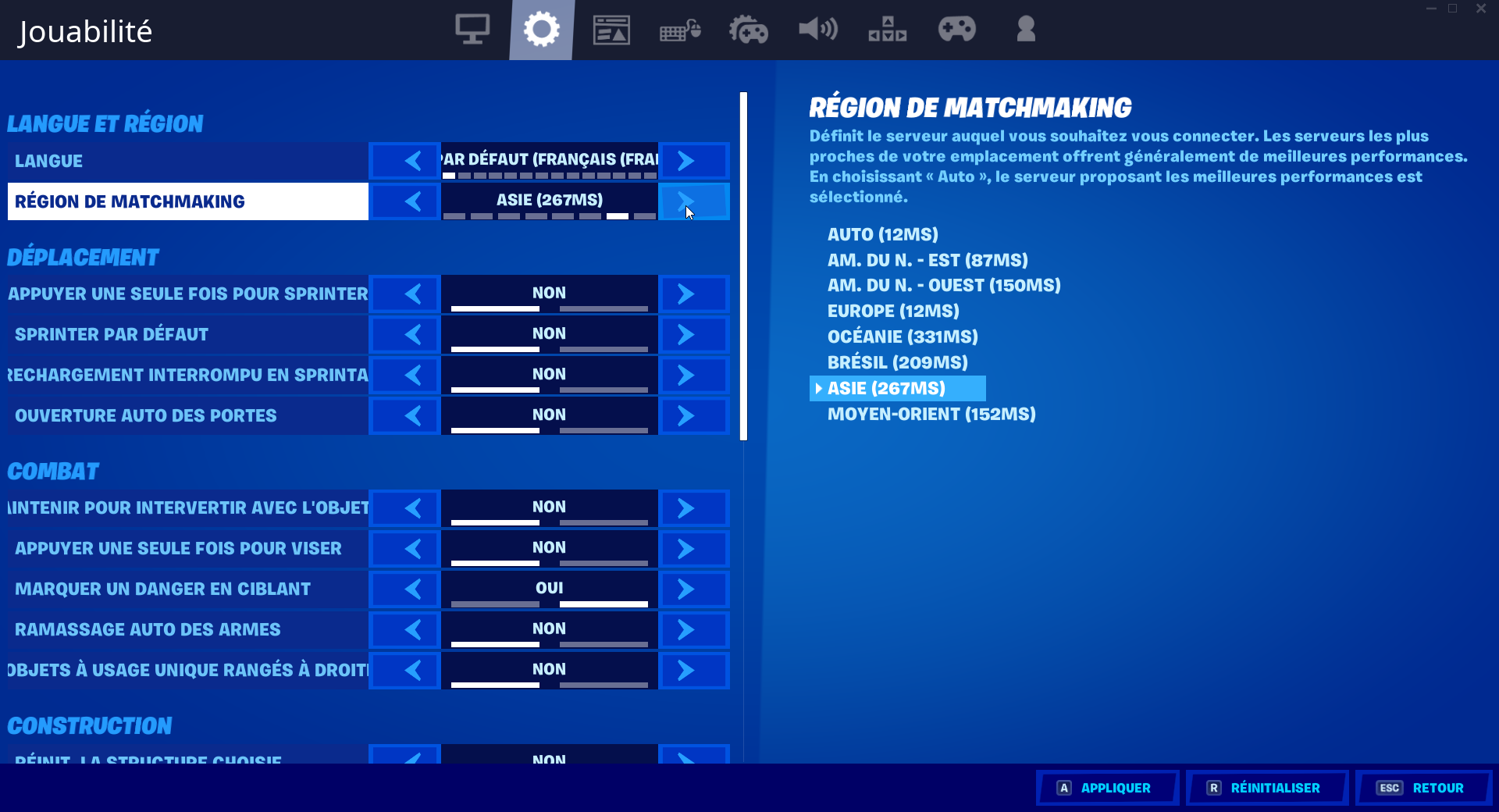 Vous l'aurez compris, si vous souhaiter participer au tournoi, vous devrez rejoindre les serveurs Asie ou Océanie ! Pour cela, vous devrez modifier sur le serveur sur lequel vous vous trouvez dans les paramètres de Fortnite.