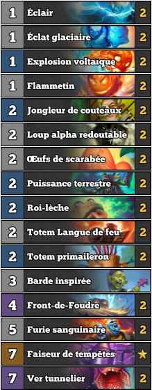 Ce deck Chaman est assez simple à jouer et peu coûteux, son but est tout simplement d'innonder le board de petits serviteurs, le plus souvent des élémentaires, pour ensuite les améliorer et gagner la partie. On retrouve ainsi des cartes à faible coût comme le Flammetin ou les Oeufs de scarabés qui permettent également de générer des créatures supplémentaires. Pour les améliorer le deck possède des cartes comme la Puissance terrestre, le Loup alpha redoutable ou bien le Faiseur de tempêtes. Toutefois le deck manque un peu de moyens de contrôler le board et peut ainsi être mis en difficulté si il se fait déborder par l'adversaire.