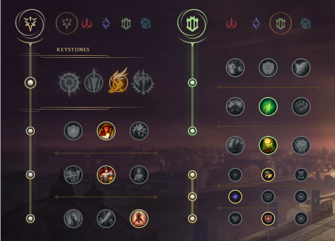 La Danse de la Mort vous aide encore plus à résister au burst pour vous laisser le temps de placer un Z puissant en combat d'équipe. Le Couperet Noir synergise très bien avec la Lame du Roi Déchu. L'Ange gardien, le Visage Spirituel et le Présage de Randuin sont tous les trois des options défensives intéressantes en fin de partie. Le Visage Spirituel est à privilégier contre des équipes avec beaucoup de mages et le Présage de Randuin contre des équipes avec beaucoup d'assassins ou de tireurs.