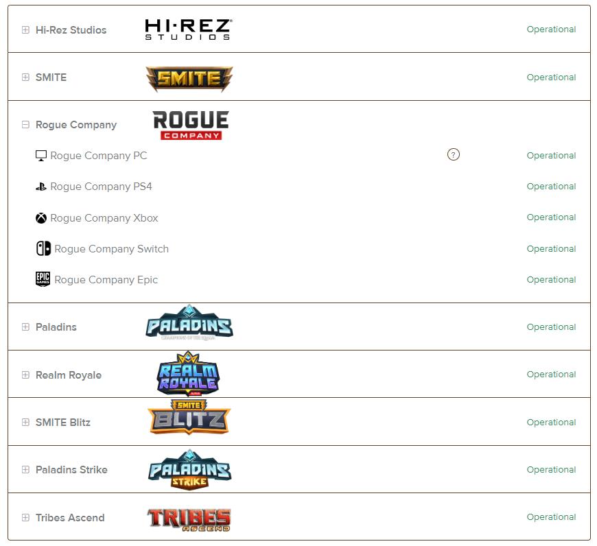 Sur ce site, vous retrouvez l'état de tous les jeux d'Hi-Rez mais aussi par plateformes de jeu pour chacun des titres. Il vous suffira de cliquer sur le petit + à côté du jeu concerné pour voir l'état du service en lien avec votre plateforme.