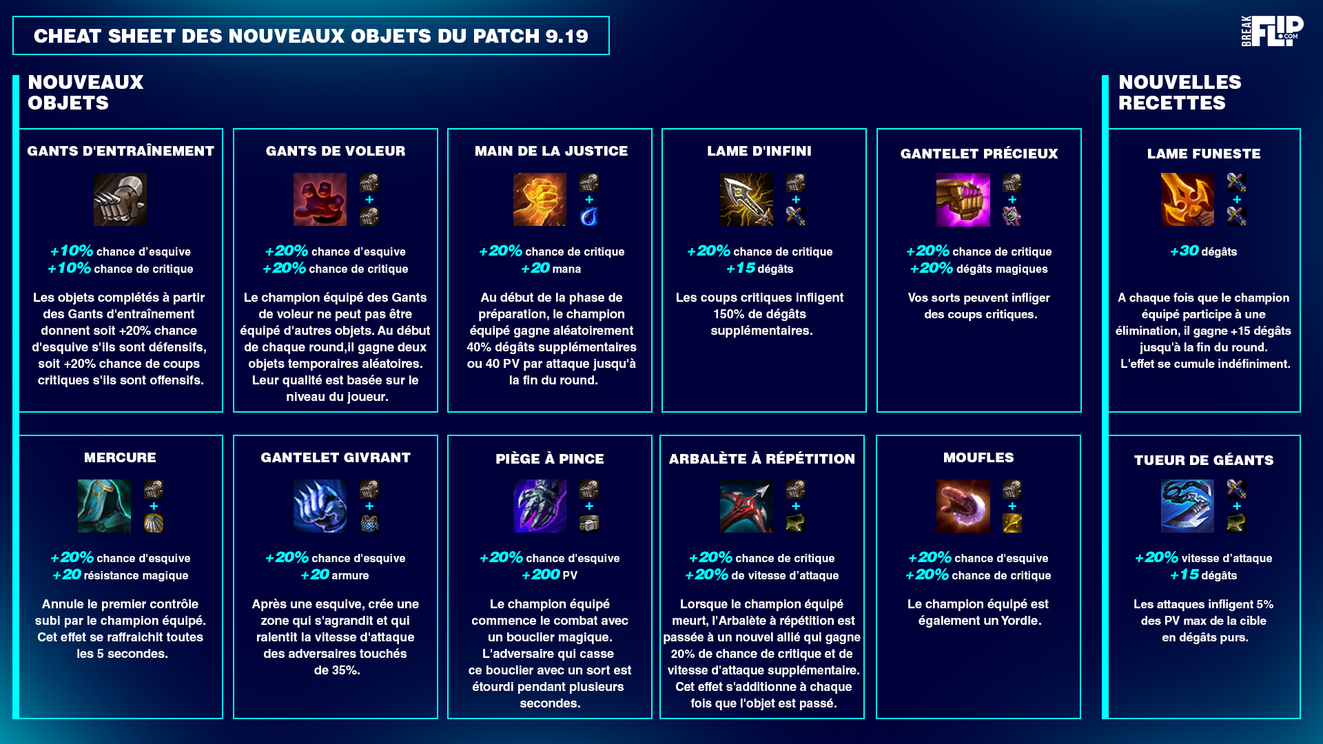 Le patch 9.19 de Teamfight Tactics a amené de nombreux changements, dont les plus impactants sont sans doute l'addition de 9 nouveaux objets et la refonte de 2 anciens. Avec les Gants d'entraînement et tous les nouveaux items qui sont possibles de faire avec, il est important d'apprendre les différentes recettes et effets au plus vite afin de ne pas être perdu sur TFT. C'est pourquoi nous vous proposons un cheat sheet afin de toujours savoir quoi équiper à vos champions !