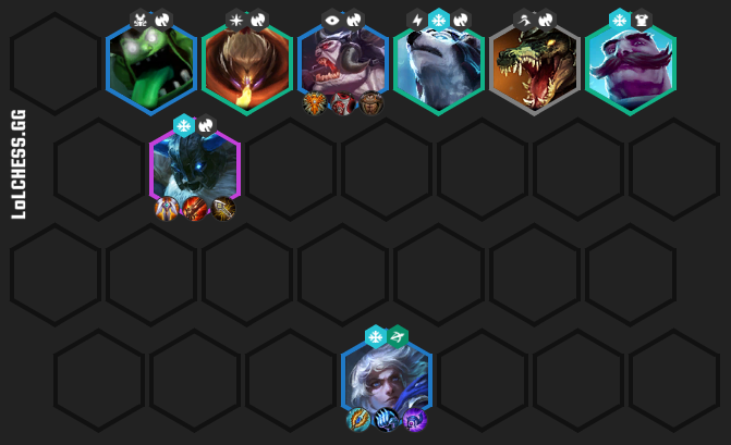 Au niveau 8 vous pourrez ajouter tranquillement un quatrième Glacial (souvent Braum), voire envisager d'autres options selon les unités légendaires que vous trouverez (Poison si vous avez Singed, Foudre si vous trouvez Zed ou Lux Foudre...).
