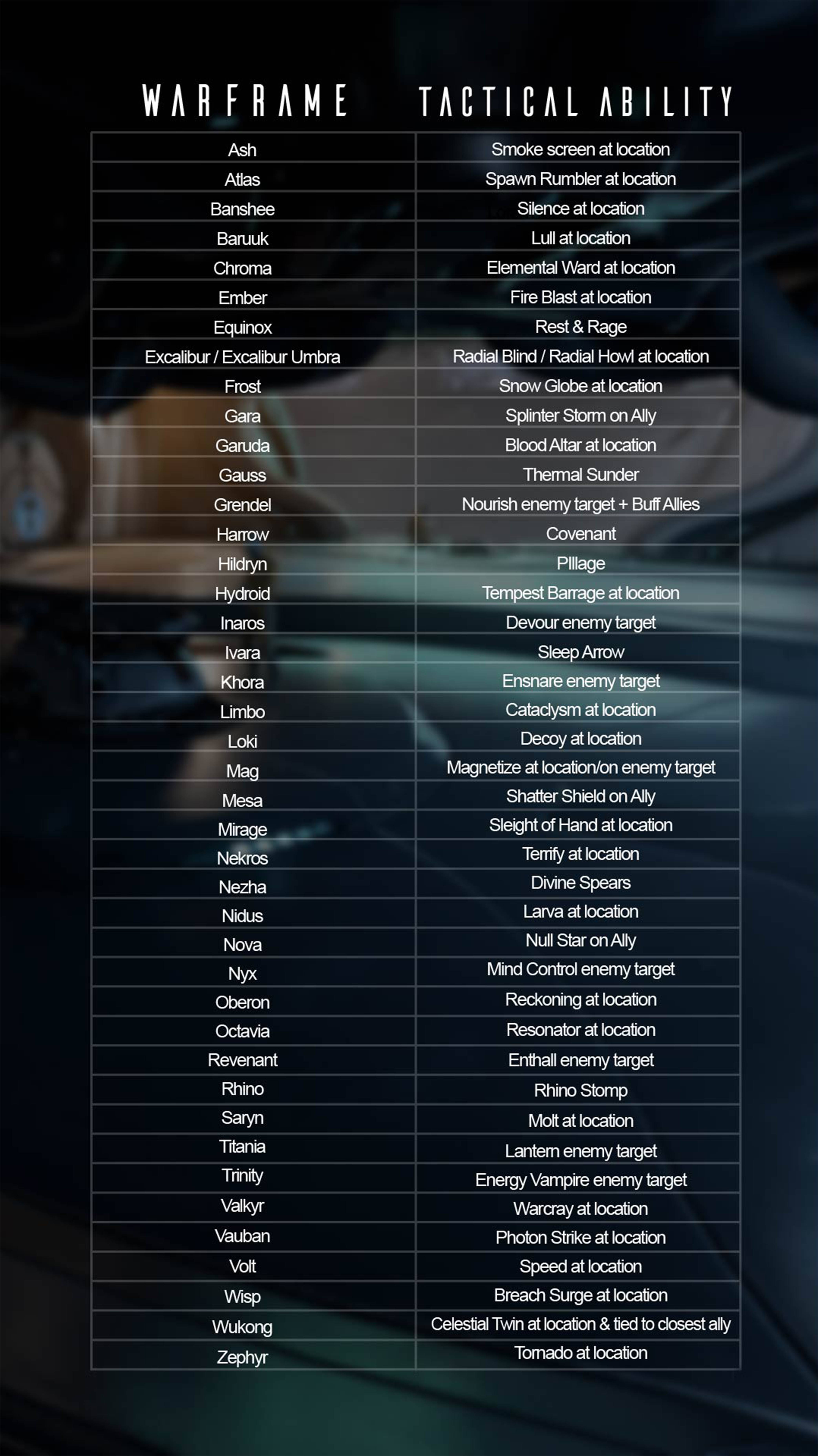 - Tactique : Vous être le Tacticien de l'équipage. Augmente votre concentration pendant la bataille. Améliore vos compétences tactiques telles que le retour au Railjack, de nouvelles compétences de déploiment tactique etc...