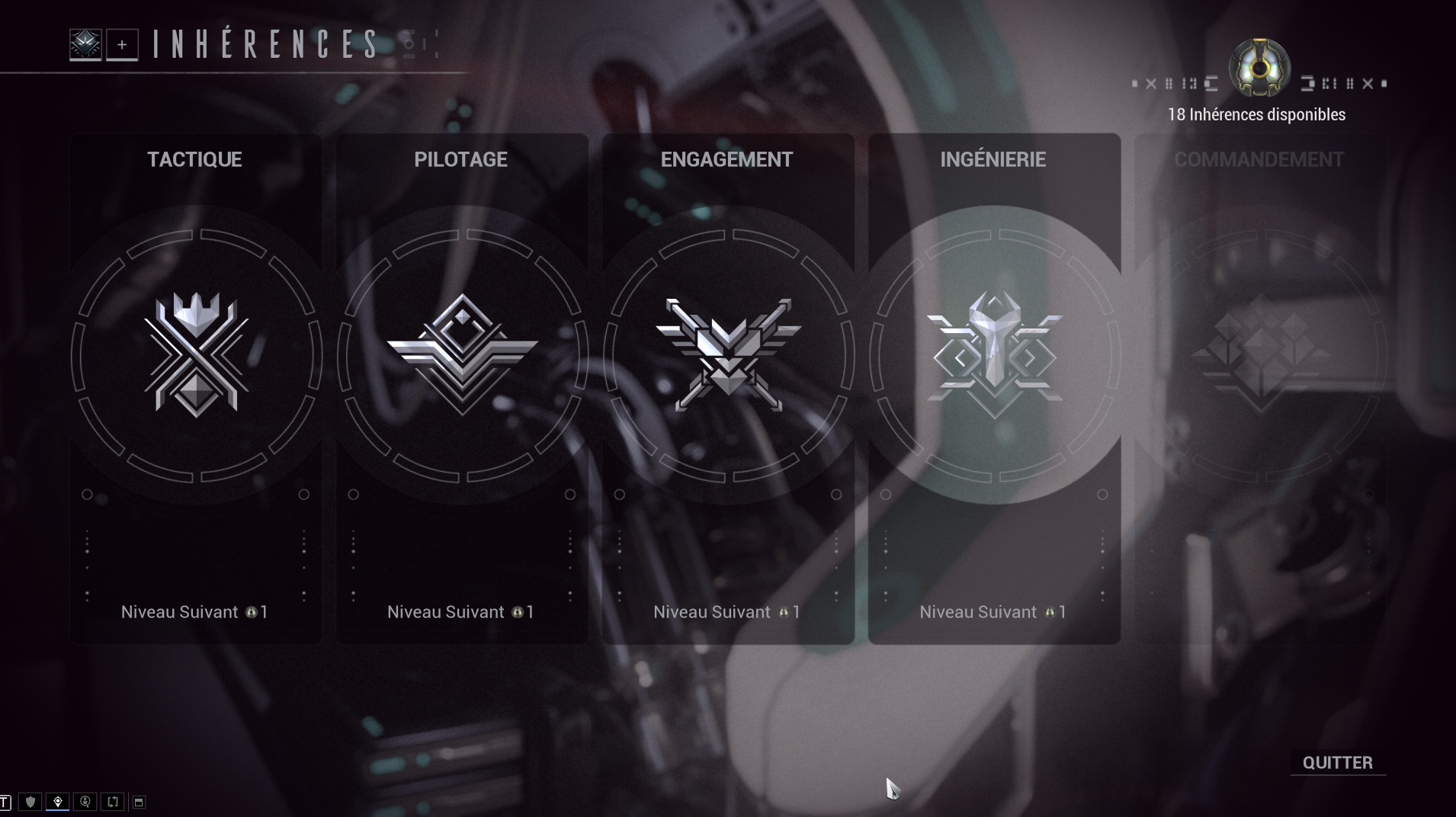 Vous pouvez augmenter vos niveaux d'inhérences une fois de retour dans votre Cale Sèche ou depuis le menu Profil (Echap > Profil > inhérence) une fois que vous êtes revenu dans votre Orbiteur.