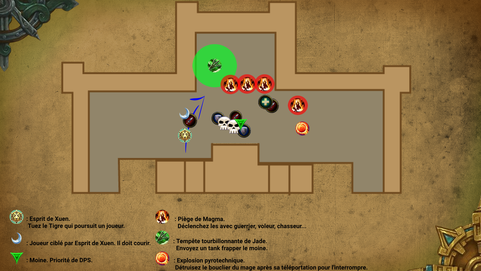 De plus le moine s'écarte pour lancer des Tempête tourbillonnante de jade. Un tank devra l’engager en mêlée. Enfin, il invoquera Esprits de Xuen. Le joueur ciblé doit s’écarter et les autres devront contrôler et tuer le Tigre