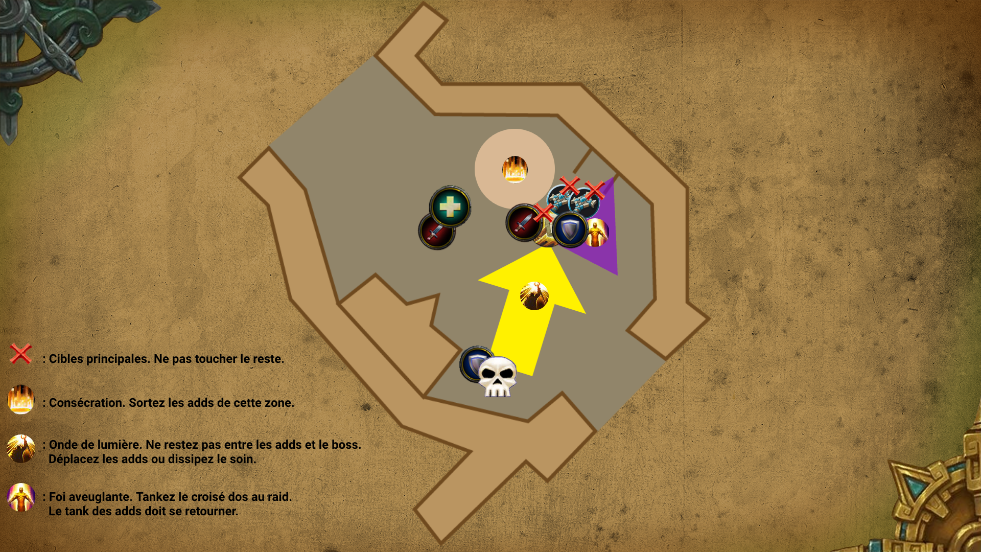 Les croisés posent des Consécrations dont il faut sortir tous les acolytes et utilisent Foi aveuglante. Tout le raid doit être placé à tout moment dos à l’add pour ne pas être désorienté. Le tank des adds devra se retourner.