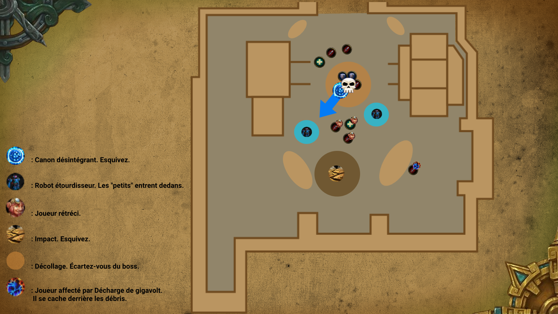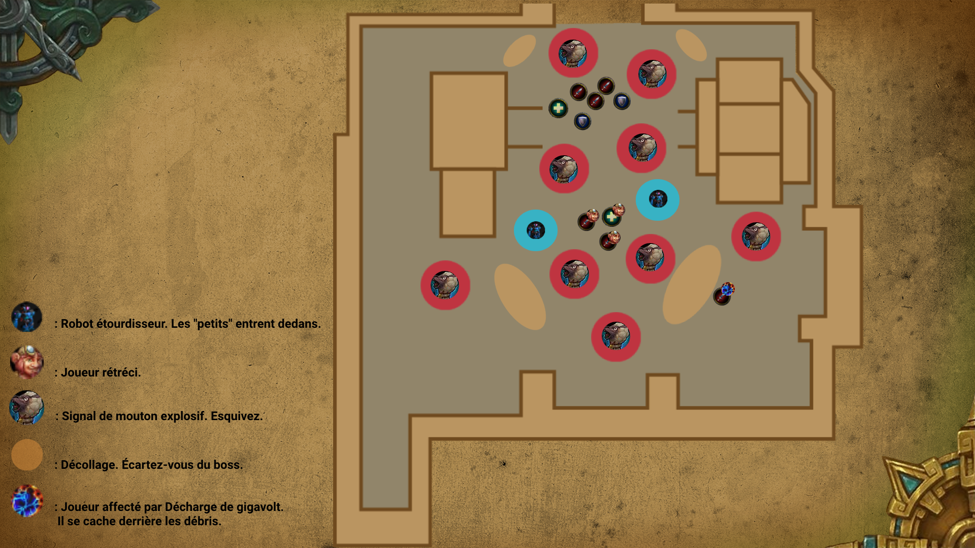 Le gnome appelle fréquemment des petits Robots étourdisseurs . Il faut contrôler puis rapidement tuer ces robots, infligeant des dégâts et étourdissant autour d’eux ainsi que des dégâts à des membres aléatoires du raid. Cependant, ils ne prennent pas de dégâts. Les petits joueurs doivent entrer dans un robot. Ils arrivent toujours 2 par 2. Dans votre robot, vous devrez entrer une série de couleurs dans l’ordre. L’autre petit, dans l’autre robot, voit votre code couleur apparaître progressivement au dessus de votre robot. C’est ce joueur qui vous dictera l’ordre de votre code parce que vous ne le voyez pas. C’est aussi vrai pour lui : vous lui donnerez l’ordre de son code couleur, affiché au dessus du robot, une couleur par une couleur. Si vous vous trompez ou si vous prenez plus de 45 secondes, vous êtes presque sûr de mourir. Si vous tardez trop à vous occuper des robots, ils ne seront plus contrôlables.