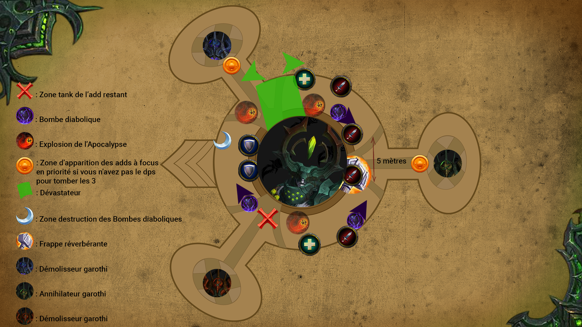 Pendant que l'autre tank est sur le boss, éloignez le raid du marqueur pour permettre au tank de casser les Bombes Diaboliques sans tuer le raid. Attention les soigneurs, les dégâts seront importants.